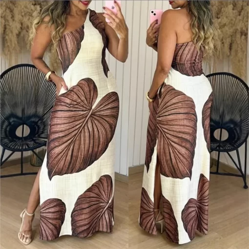 2025 Summer New Elegance Print Dress Sleeveless Oblique Shoulder Women Sexy Slim Floor-Length Side-slit Skirts Tropical Vacation
