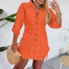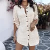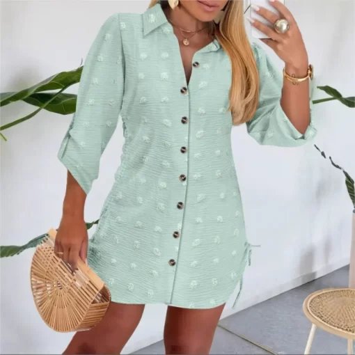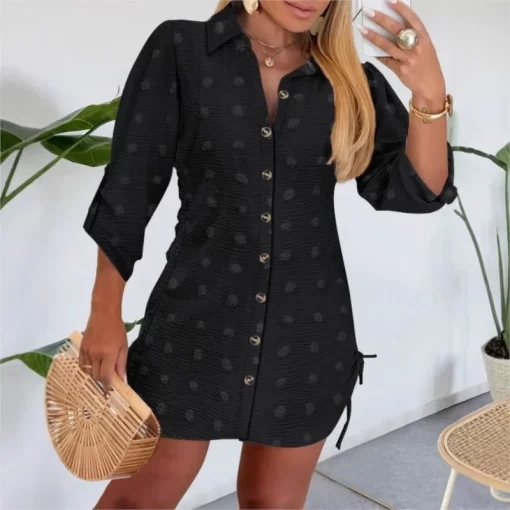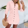 Women 2025 Spring New Button Down Shirt Dress Solid Color Shirred Roll Sleeve Side Drawstring Mini Dresses Casual Loose Dresses